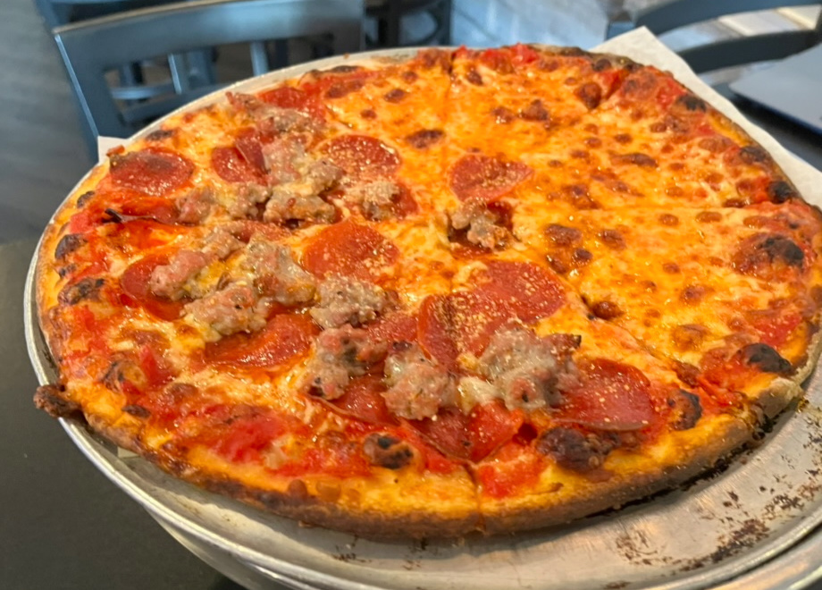 For my order, I kept things classic, a small pie, half plain for tradition’s sake, and the other half adorned with sausage and pepperoni.