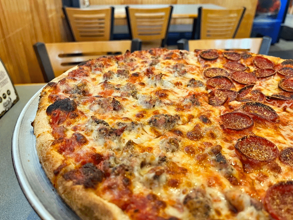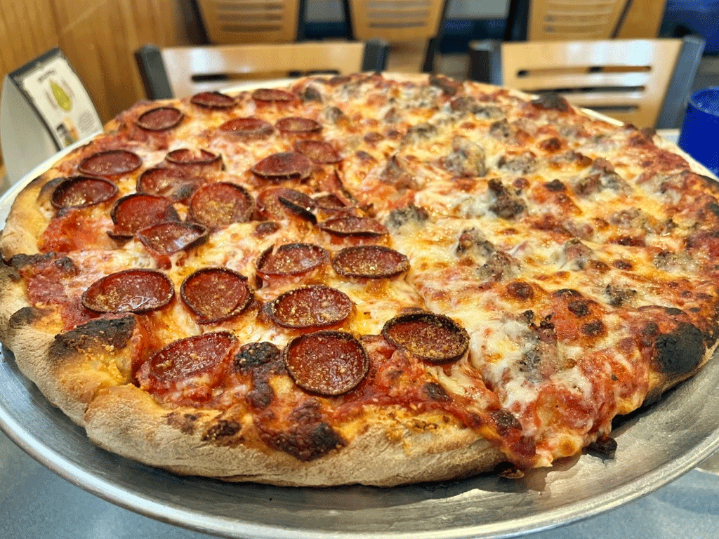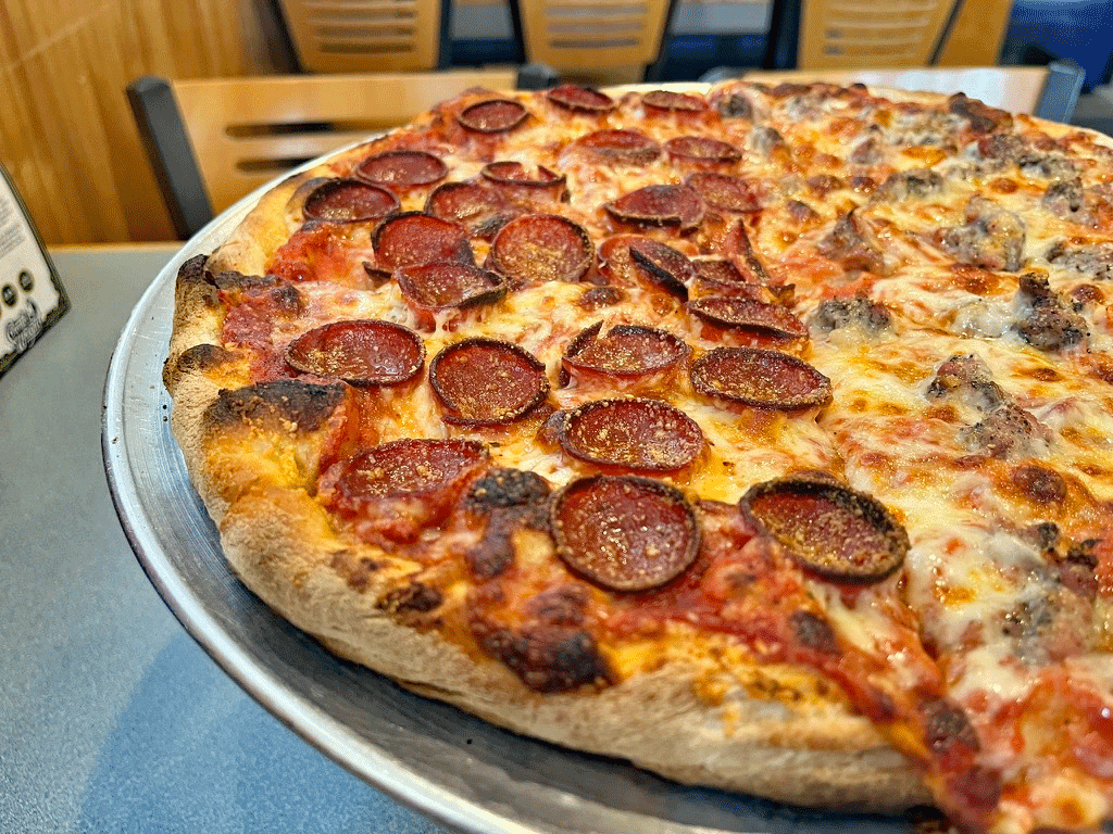 I pulled a little piece of the crust and tasted it. First, the texture was denser than I prefer, it was neither a crispy crack crust, nor a soft rendition, and the flavor was pretty good. My next stop was a slice of the pepperoni. The edges were crispy (positive #1), the slices were thicker than many others (positive #2), which allowed for a softness that I really liked (positive #3) and then the spice level kicked in, it was on the higher end of the spiciness scale, maybe a 7-8. If you like a spicier pepperoni, this will please you. Onto the sausage side and it was much milder, the kitchen was generous with the amount of crumbled pieces (my preference), they were still juicy and soft, and I was a big fan immediately.