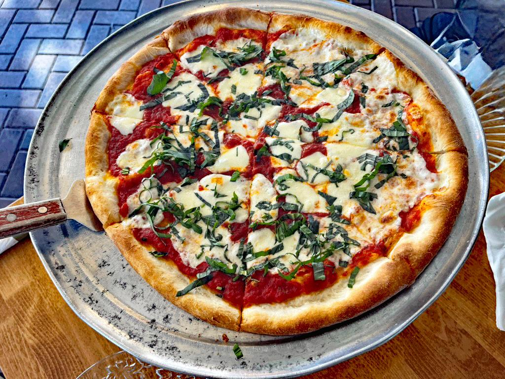 When the pizza arrived, it was immediately clear we were in for a delicious lunch. The pie looked fantastic and tasted even better. The crust was light, airy, and flavorful, with a subtle sweetness. As we pulled the slices apart, there was just a slight stretch. One bite was enough to remind us why we had enjoyed this place. The house-made sauce was rich and deeply flavored, applied generously, and the cheese, enhanced by that hint of cheddar, was excellent. A scattering of chiffonade of fresh basil finished the pie, adding a lovely earthy note.