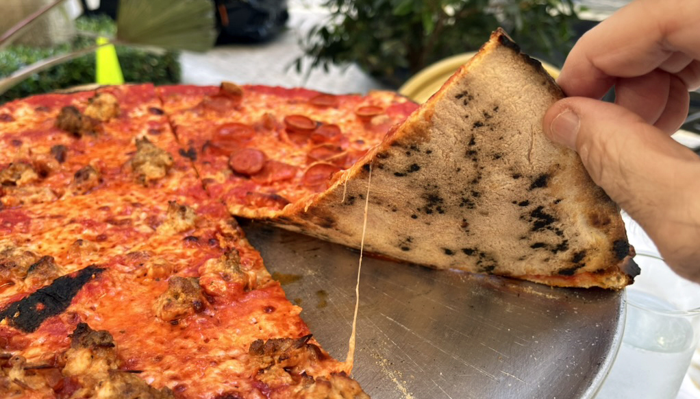 When it hit the table, I was impressed. The sauce extended almost to the edge, leaving just a small border of beautifully charred crust from the coal fire. The sauce itself was a deep, rich red, applied generously but not excessively. The cheese was evenly layered, and the toppings were abundant without being overdone, hearty chunks of sausage and curled slices of pepperoni with a touch of oil in many of them.