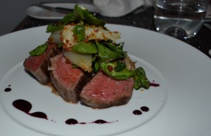 served with guanciale, pea shoots and served over a black aioli and topped with crisp fried garlic and smoked paprika breadcrumbs. The hamachi is a delicious trio of presentations: a tartare, a citrus cured loin and a sashimi belly. The latter is wrapped with a thin slice of Asian pear. The flavors of the hamachi are combined with several forms of yuzu and ginger oil and finished with a fennel puree, crispy shiso and red beets plus a little cilantro. The combinations of these flavors were citrusy with just a touch of heat from the ginger and yuzu. The local lettuces and the roots, et. al. are farmed at Millstone Farms and present a variety of seasonal ingredients. Chef Lewis prepares the roots, shoots, fruits and leaves with a variety of methods including raw, braised, confit, dried and pureed. Included in this cacophony of flavors and colors is an incredibly flavorful mousse comprised of goat cheese and medjool date puree. These last two appetizers present a crisp and refreshing start to the meal.