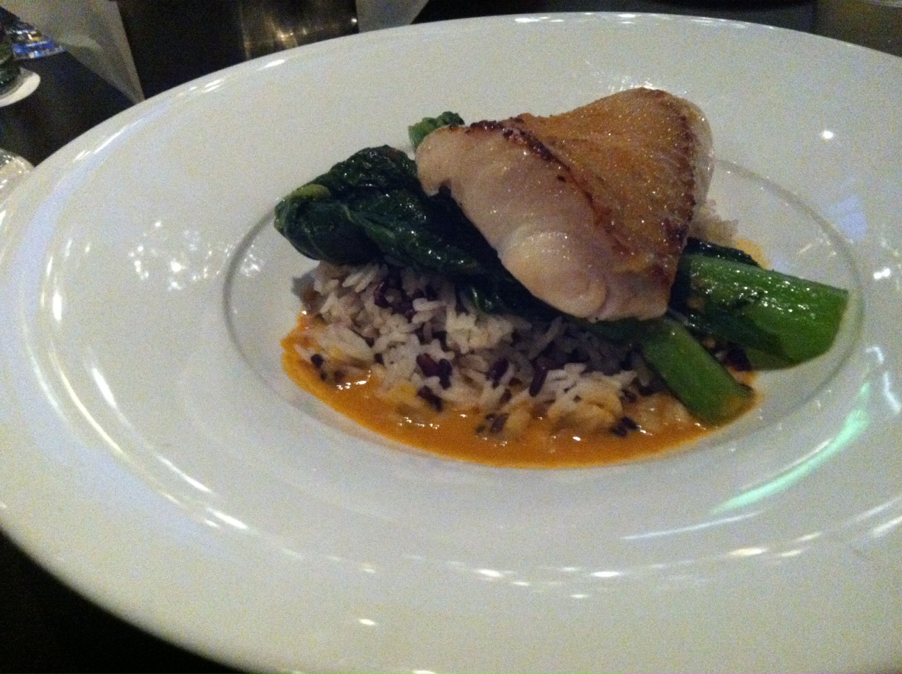 The miso glazed Black cod with mustard greens was a picture perfect presentation, but the flavors were all over the spectrum, from non-existent to spicy. The fish was perfectly cooked and was moist as expected in a fatty cut of fish. The miso glaze was very uneven with certain bites delicious and others with no flavor. The mustard greens were nicely prepared but did not have that slightly bitter-y quality I was looking for. Both of these components sat atop a rice pilaf, which was about as flavorless as possible. It was akin to basic boiled rice. These were all nestled in a red sauce that had a good kick. Overall I did not like this dish and would recommend going in a different direction…it has potential but needs a little TLC from the kitchen.