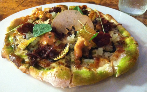 With one down and my hunger not yet fully satisfied I acquiesced and ordered the Cider Ham Rules. Fortunately the restaurant was more filled at this point and the timeframe before #2 arrived was sufficient to regain some internal space. When it arrived, it was not as expected; it was more fully covered than the Piggie Pie. Adorning this pie were compressed apples, a fried apple chip, waffle fries, oyster mushrooms, and various cuts and renditions of pork. As much as I wanted to love this version to the same degree as the first, the sweet-savory combination left the sweet as an “also-ran” component. The flavors of both renditions of the apples were completely lost and the waffle fries were a cute addition but from a taste perspective, not to my liking. The rich, deep flavors of the pulled pork, chunks of pork, hoisin sauce and oyster mushrooms were outstanding and absolutely delicious. I thoroughly enjoyed the savory aspects of this pie, but not as a sweet-savory combo.