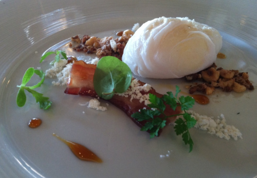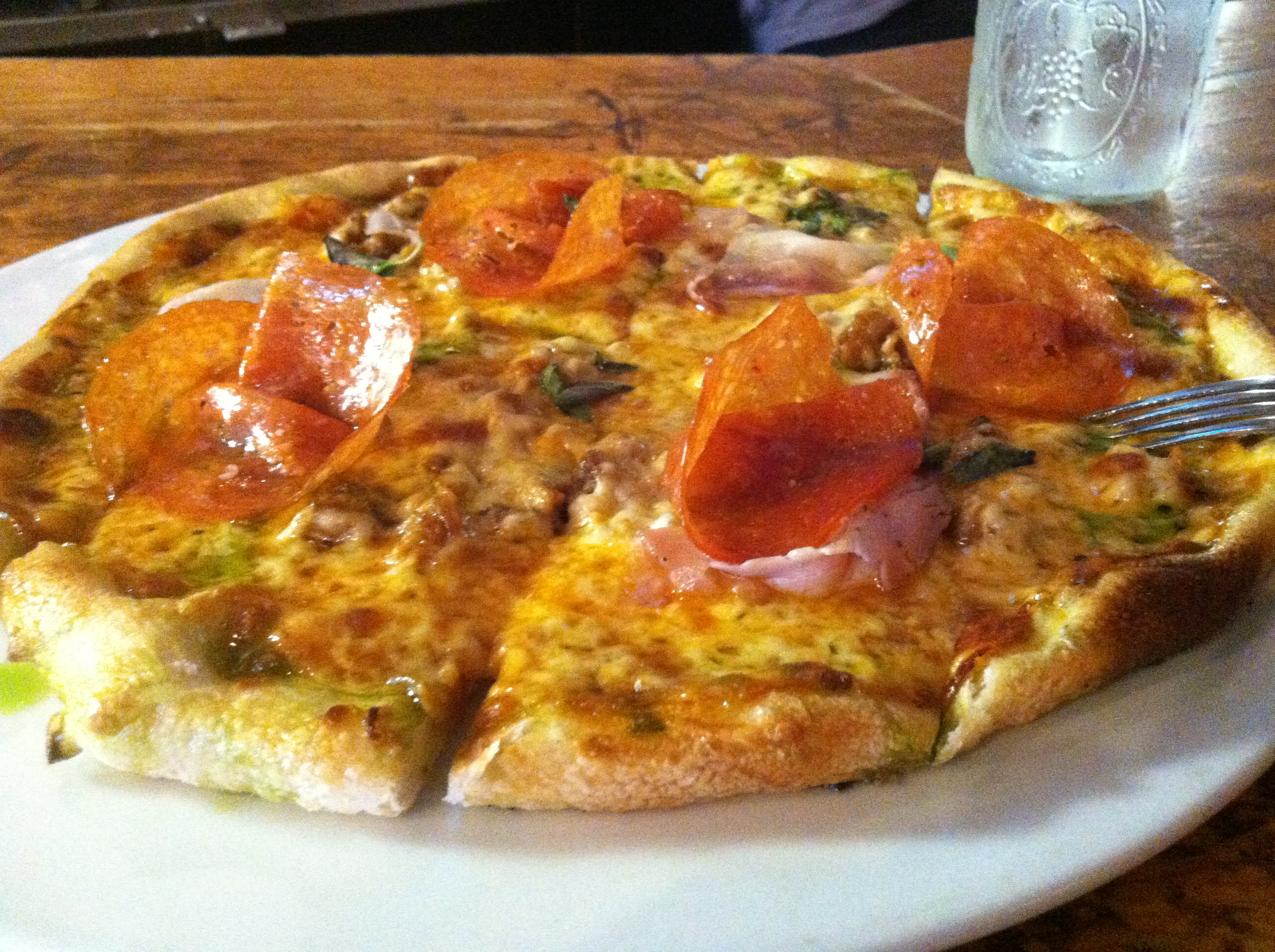 I sat at the bar and the bartendress pushed the Cider Ham Rules pie pretty hard to all the guests but I first wanted a carnivore’s delight so the first pizza was the Piggie Pie. Normally served with a thick brioche crust, I opted for the thin-crusted alternative. The toppings included large slices of prosciutto, pepperoni and lots of sausage hidden under the cheeses. The flavors were outstanding. Each was delicious on its own with the saltiness and spiciness of the meats perfectly complementing the sweetness of the tomato sauce. Not to be outdone, the chefs at TPAMP used a cheese blend of provolone, parmesan, Asiago, and Gouda (plus one that I forgot) that created an incredibly delicious combination. But the kitchen still had a few tricks and flavors up their sleeves, they finished the pie with a little basil oil and then perked the flavors with a few baby oregano leaves. And let’s not forget the crust. It brought great flavor and texture.