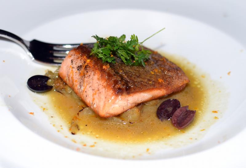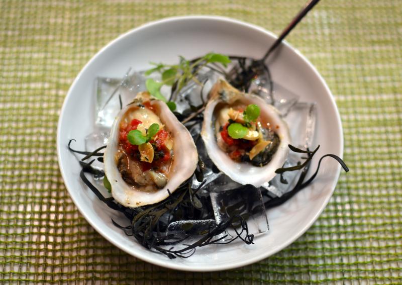 The next dish was a duet of Kusshi oysters topped with shallots, baby capers, a dash of cumin and Marcona almonds. This was one of Chef Butcher’s creations and is an indication of his talents. There were flavors galore with the mild brininess of the oysters combined with the tanginess of the shallots, the saltiness of the capers and the earthy and crunchy addition from the almonds. This all made for a delightful combination of flavors that exploded on your palate.