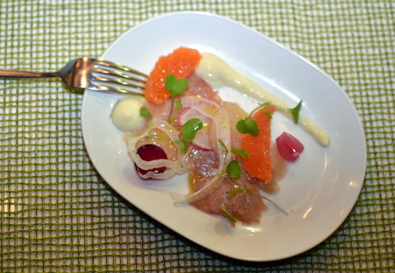 The citrus cured Hamachi with Cara Cara orange segments, fennel, grapes and finished with a habanero cream and Shishito pepper oil was divine. The sliced Hamachi was the great canvas for the abundant flavors of the other ingredients. The sweet orange segments were perfectly offset by the heat from the cream and the pepper oil and then small diced pieces of pickled shallots added the final and delicious component.
