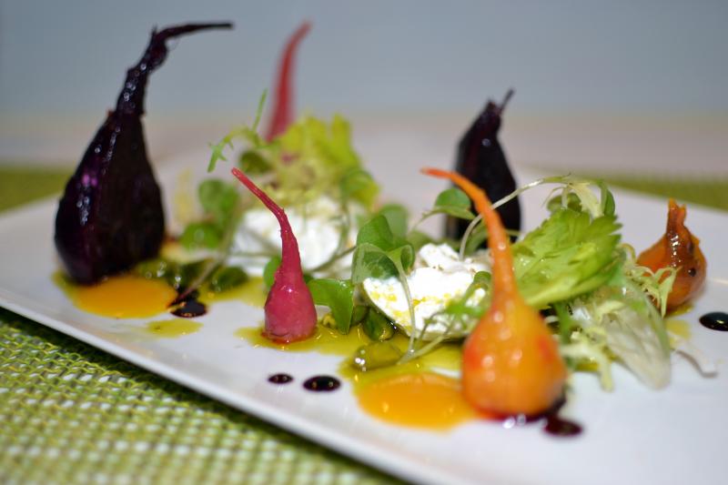 Visually, the next course was beautiful and the flavors were outstanding, the beet salad with Burrata, Sicilian pistachios, greens and citrus oils. The presentation included several variety of beets that were mild and earthy in flavor and offered subtle differences. The Burrata was creamy and elegant and balanced the flavors of the citrus and beet reductions. This was bright and delicious preparation.