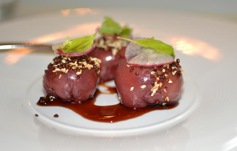The next presentation was Ahi tuna wrapped around an avocado cream and topped with a soy caramel glaze, sesame seeds, a slice of radish and a cilantro leaf. The thick slices of Ahi were delicious and when combined with the sweet richness of the soy caramel, the crunchiness of the sesame seeds and the radish and cilantro created a perfect balance of flavors and textures.