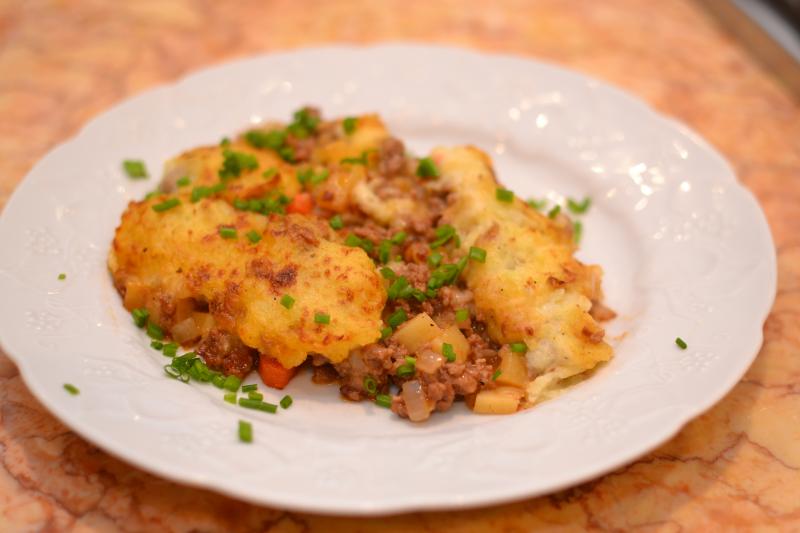 New folderShepherd’s Pie – The total time from start to finish was probably 45 minutes. The prep work is much more involved than the salmon, but still very straightforward. Boil the three potatoes, add the heavy cream and butter and mash until smooth. In the meantime, peel and dice an onion, the parsnip and the carrot. Then you sauté the meat, add the vegetables, cook, add the broths and reduce. You finish by topping the mixture with the mashed potatoes and place under a broiler to brown.