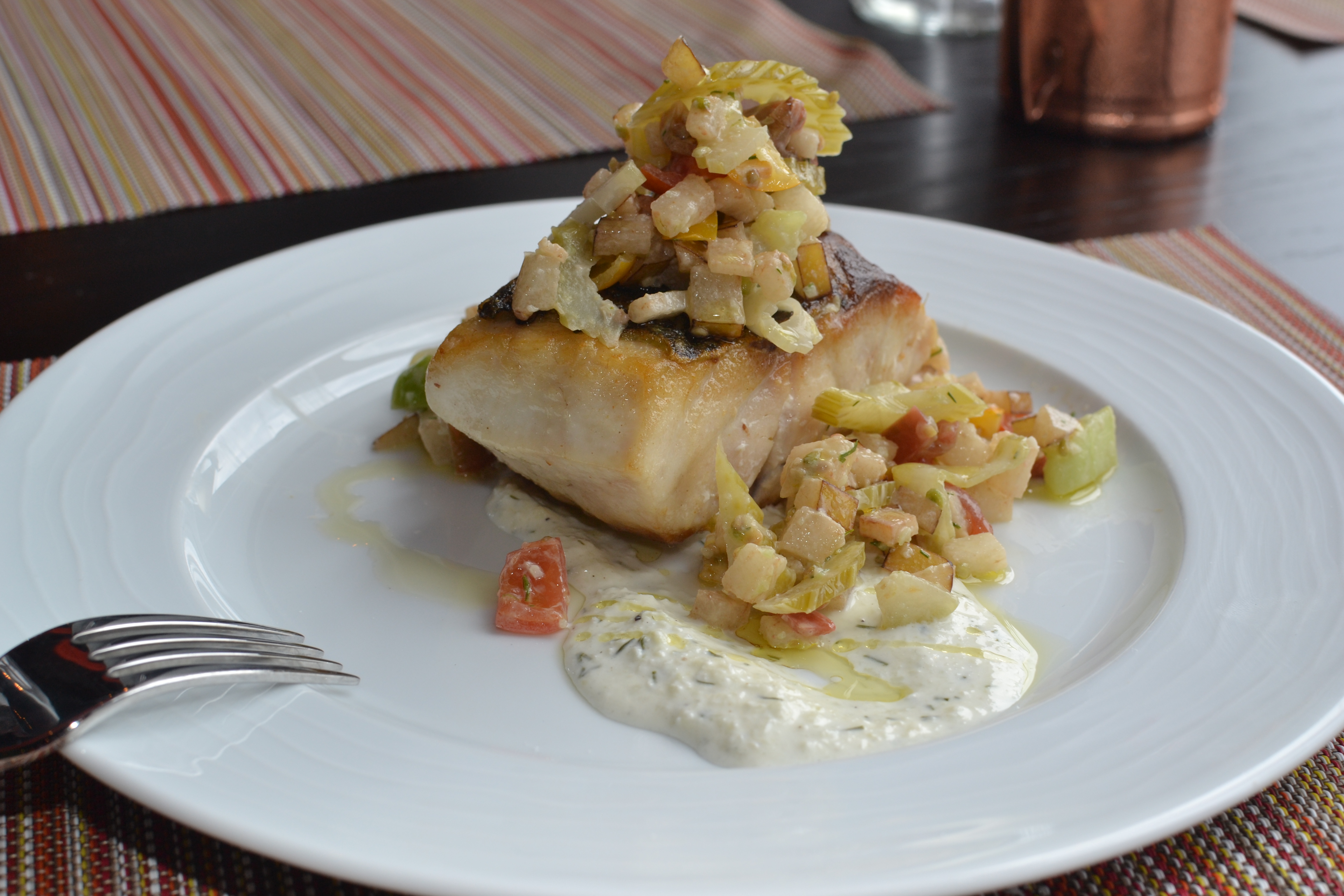 For a milder option, the LOCAL BASS was a pleasant combination of mild Mediterranean flavors. A large filet was served alongside a salad comprised of pear, celery, tomatoes and cucumbers. A swath of Tzatziki sauce finished the presentation. The filet was cooked superbly with the crispy skin offsetting the firm, yet succulent interior. I would have preferred a little more salt on the skin. The diced fruit and vegetable salad delivered a bright and light complement; the richness of the Tzatziki offered both a creaminess, plus the dill was a wonderful supplement to the overall experience