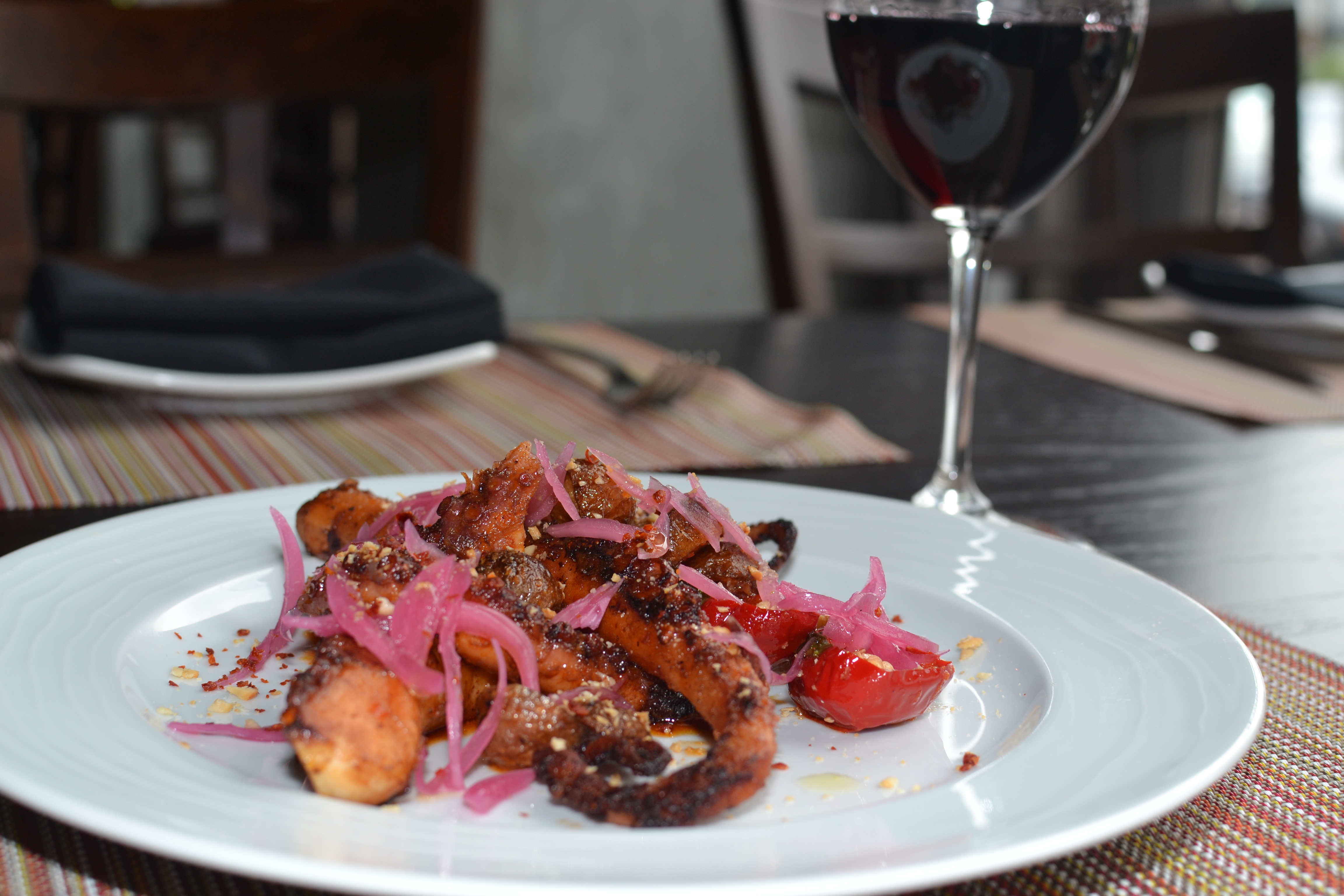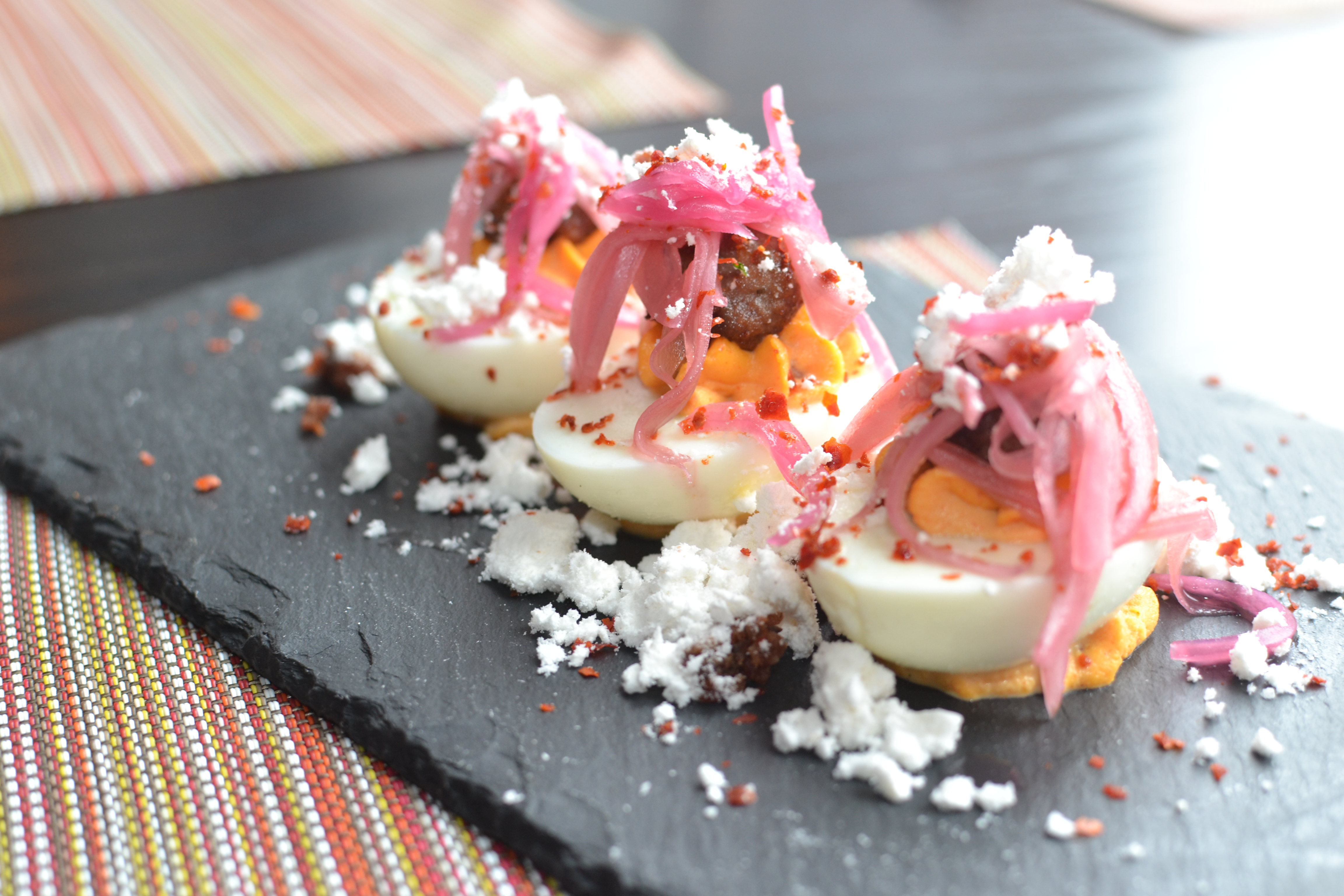 We ordered a sampling of choices from the “SMALL PLATES” section including the “DEVILED EGGS,” the “OCTOPUS” and the “POUTINE.”