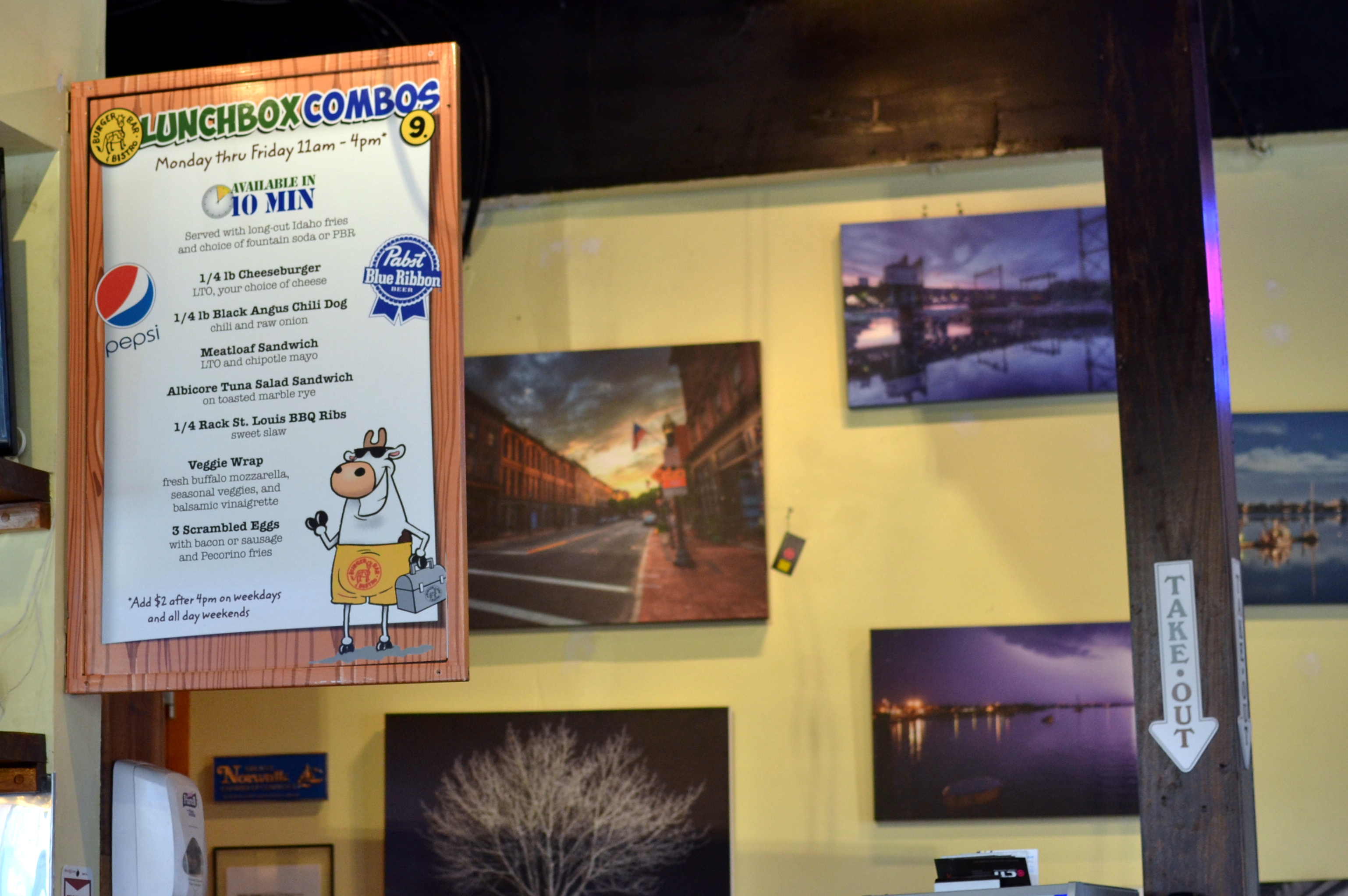 Each weekday from 11-4 BBB offers “$9 Lunchbox combos” each available in 10 minutes. Choices include a ¼-pound cheeseburger; a chili dog; a meatloaf sandwich; a tuna salad sandwich; a ¼-rack of ribs; a veggie wrap or 3 scrambled eggs, each served with fries and a choice of a soda or a PBR. Given my experience, this 10-minute guarantee is a must option.