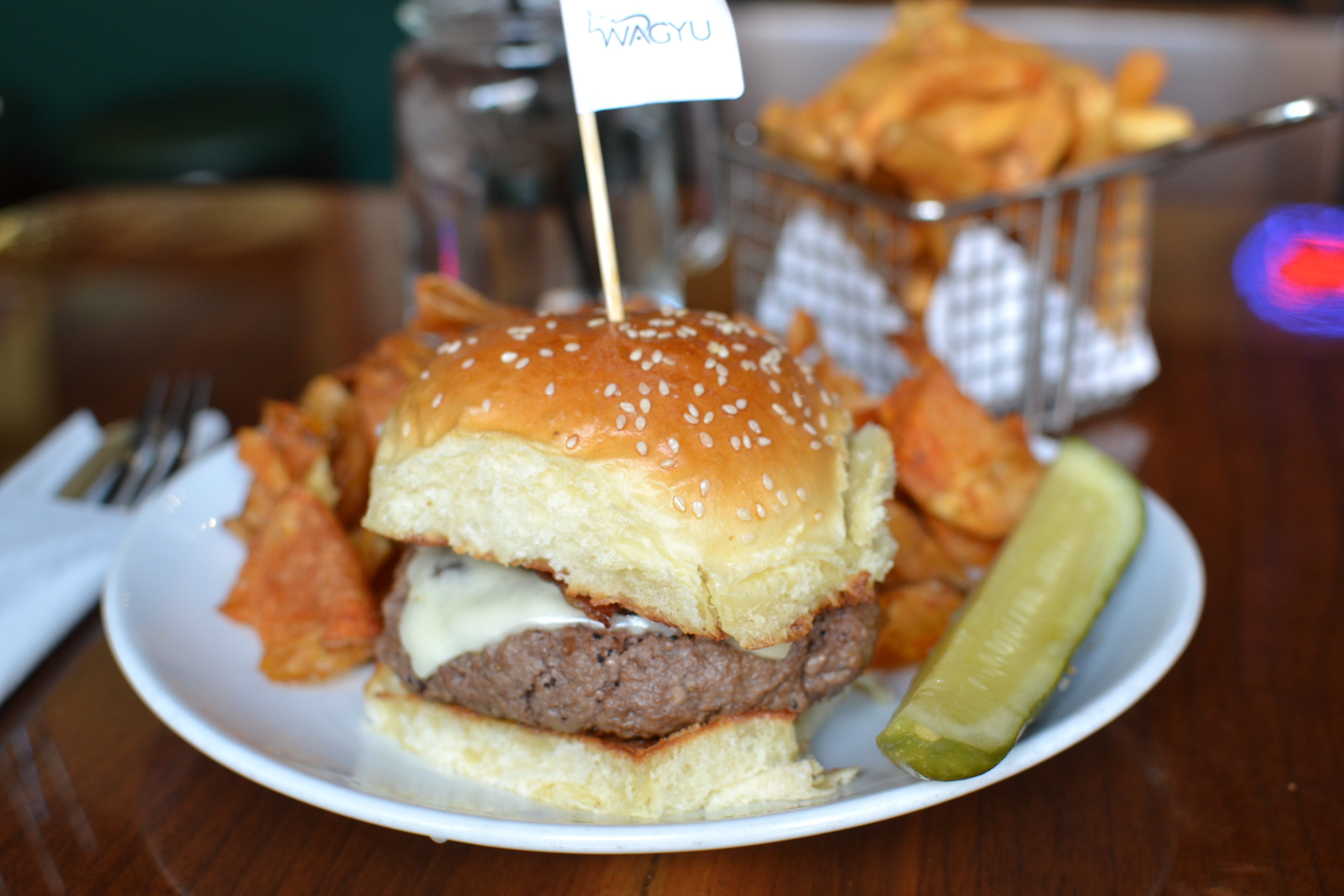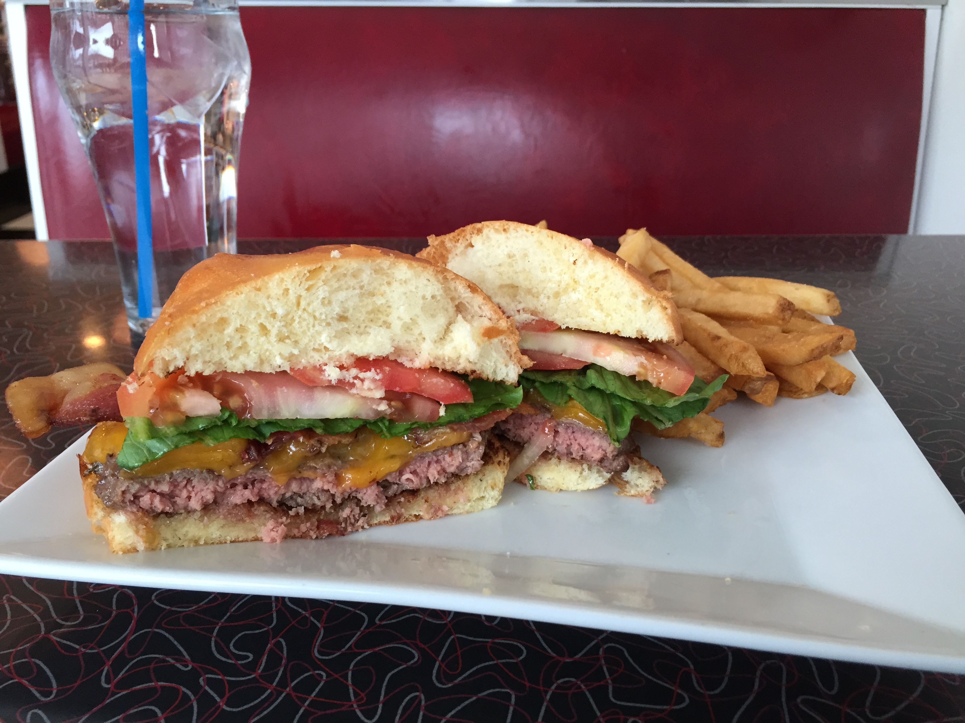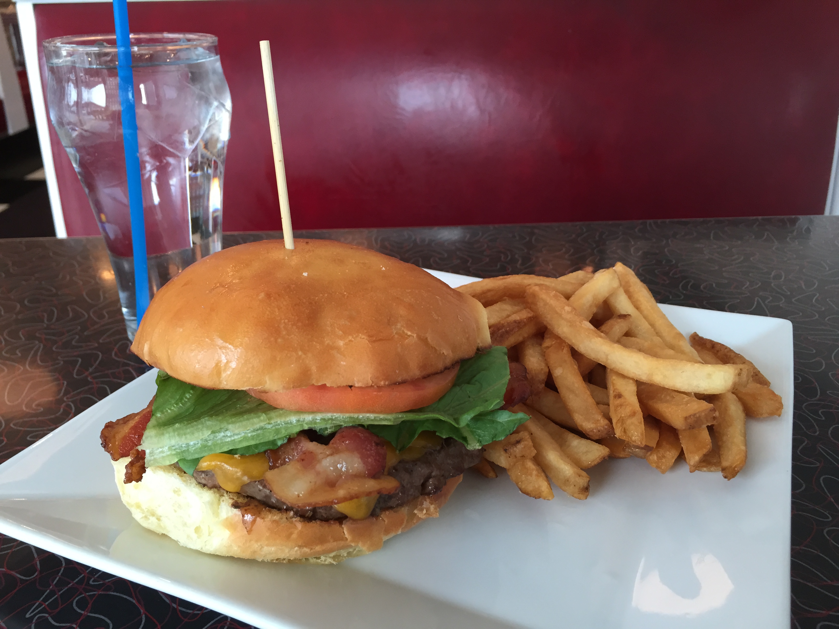 I ordered my traditional bacon cheeseburger, medium-rare and a side of fries. I sat on one of the high top tables in the bar with my back to the window and I would recommend bringing a sweater or jacket as the windows are not the most efficient and it was quite cold.