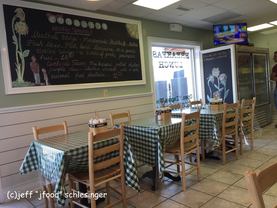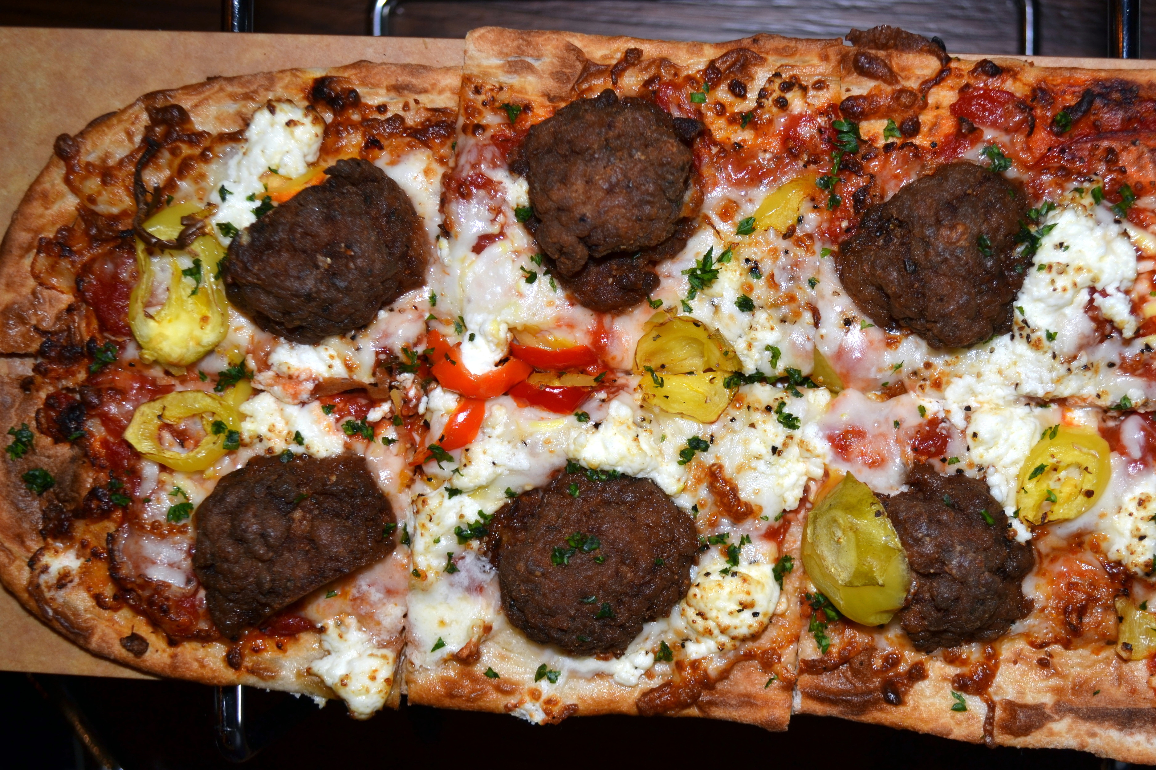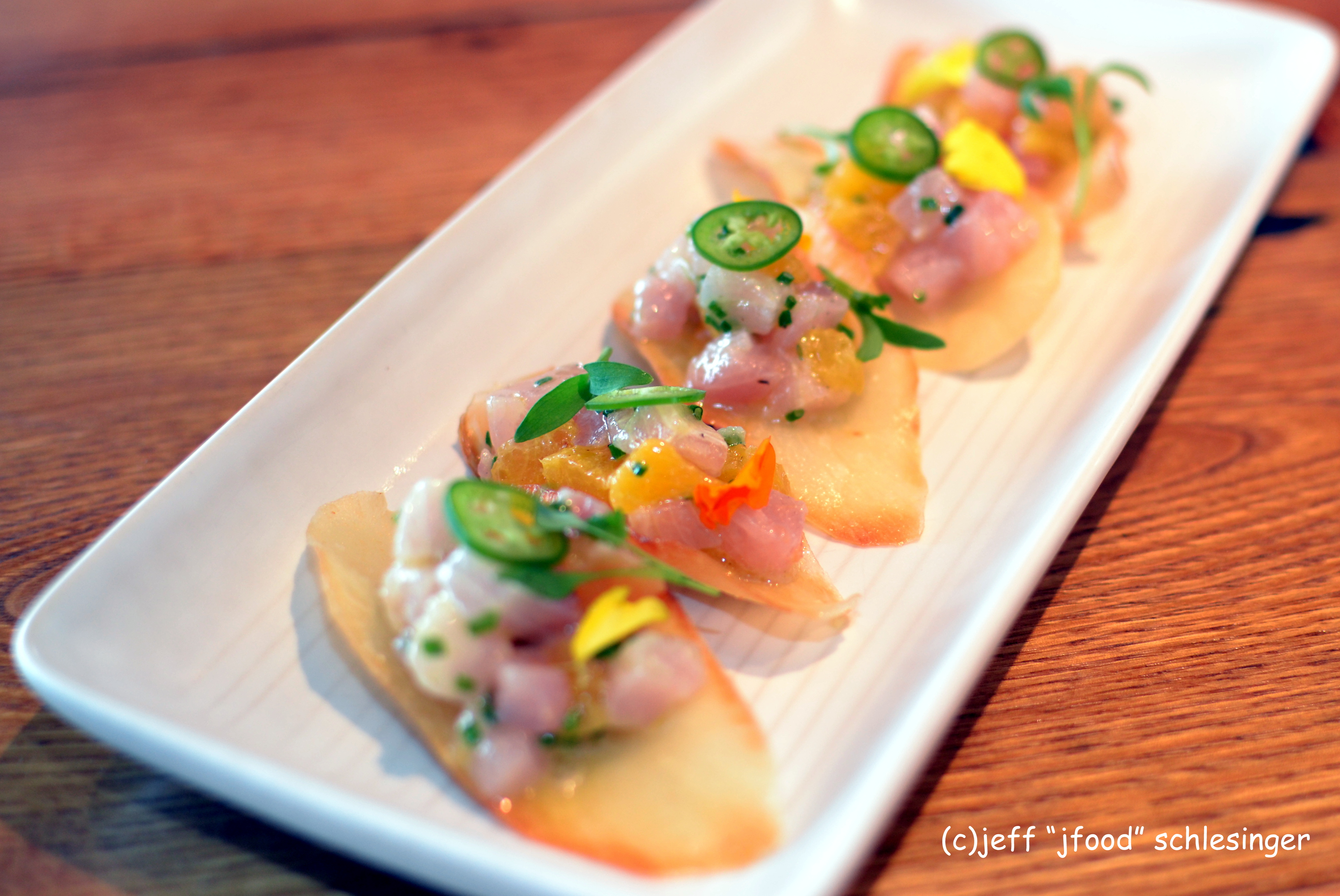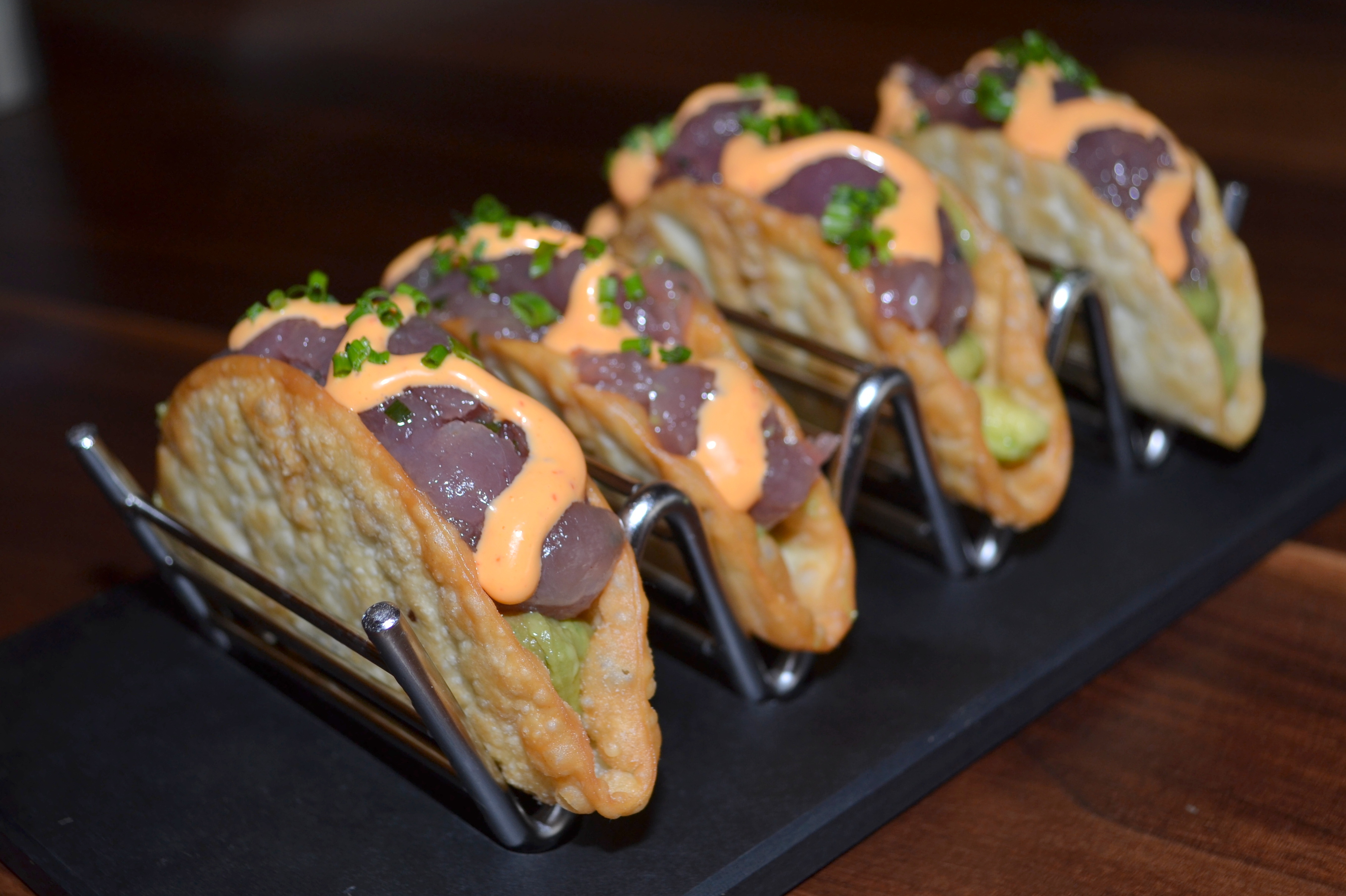 The three sharing plates were the Cheesesteak Eggrolls, the Ahi Tacos and the Spicy Pork Meatball Flatbread. My lunch companion told me the eggrolls were one of the biggest sellers, so I sampled this item first. The fried wrappers encased the beef and cheese combination, cut diagonally and served with two sauces, a sweet and spicy chili sauce and a honey mustard sauce. The beef and cheese was tasty but fought with the fried wrappers. The two sauces did not work with the beef and cheese and the entire dish, although flavorful, was not at all to my liking, more of a fun, novelty item to share on a first visit.