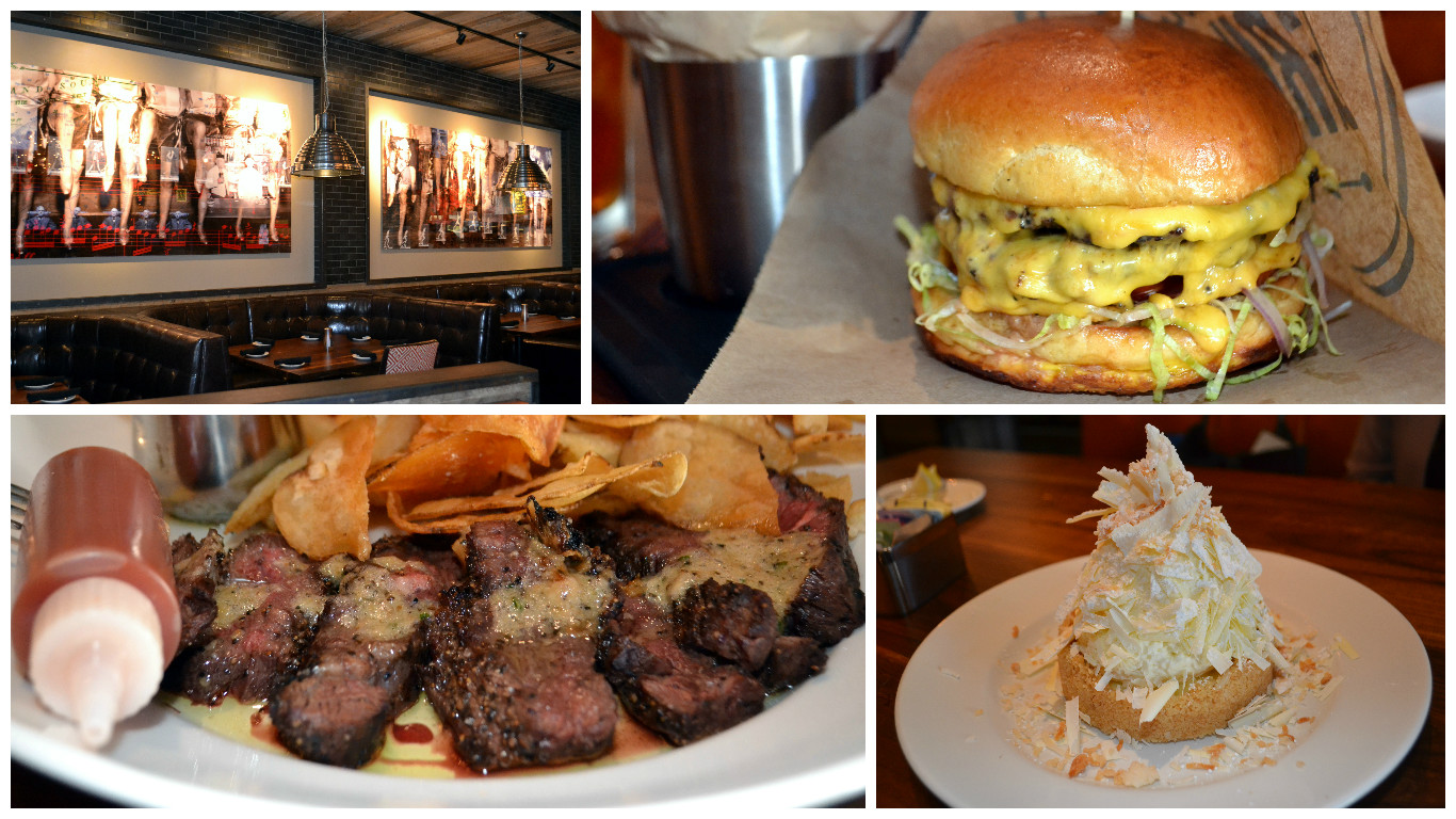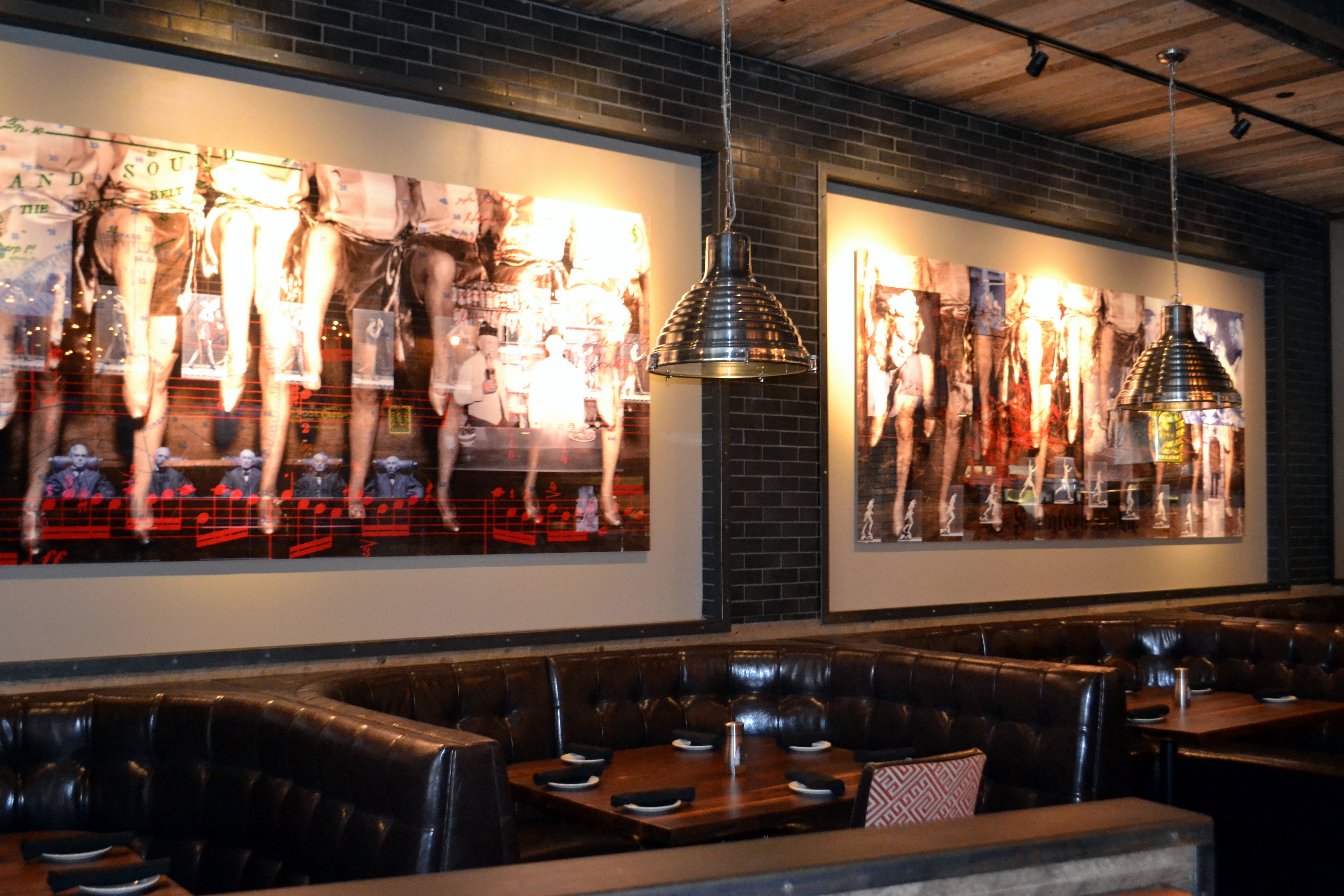 I was invited on behalf of CTbites to a lunch at Del Frisco’s Grille in Stamford, the pubbier version of the nationwide steak house, representing their twenty-second Grille opening and its first location in Connecticut. The main dining area is very open, with its soaring ceiling, reclaimed woods, large murals, and light fixtures with an industrial-hip, NYC vibe. Seating includes tables, banquettes, and a long bar, all with leather backed seats and bar stools. The large open kitchen is situated in the rear of the dining room.