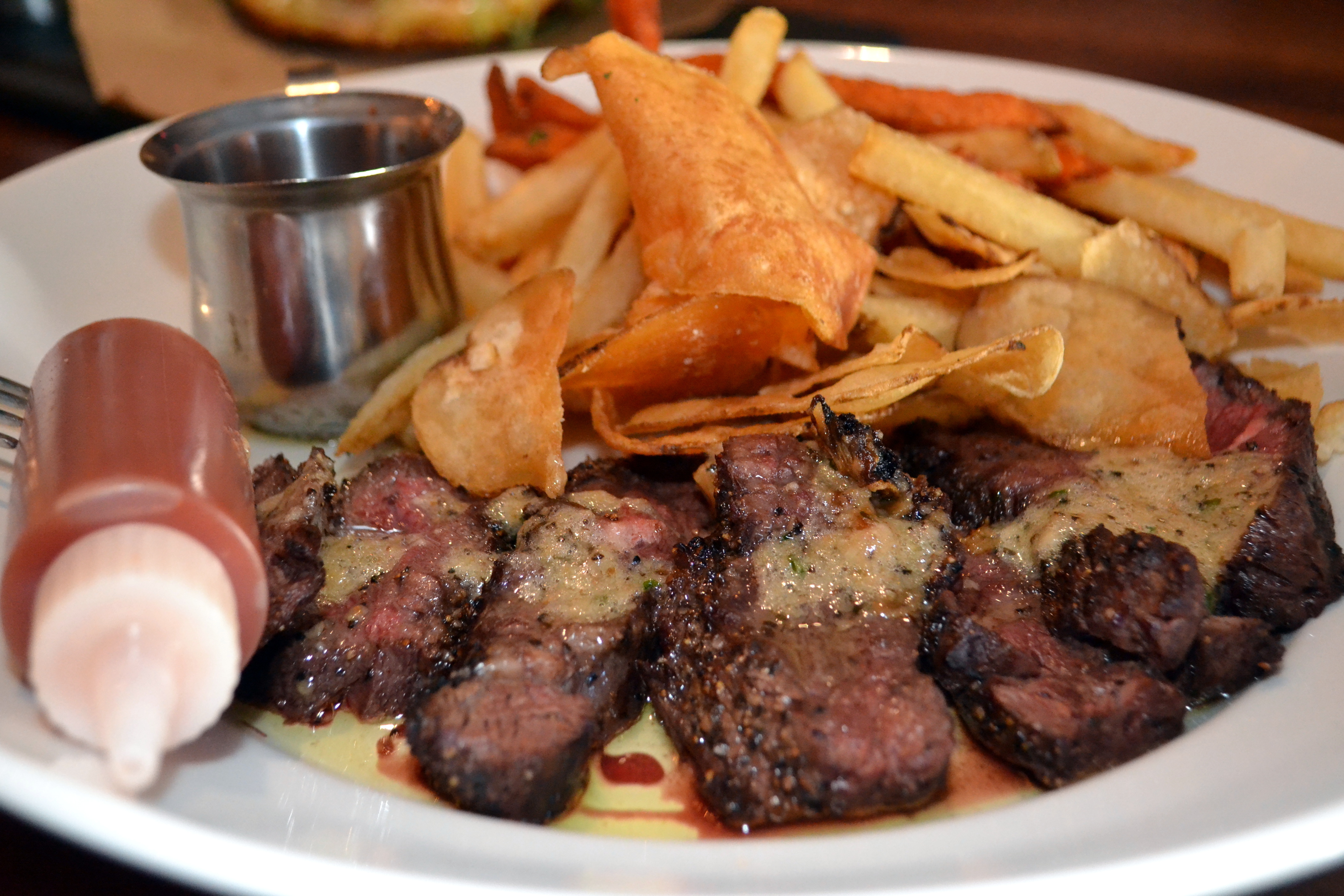The Grass Fed Hanger Steak was sliced and fanned across the plate, topped with DFG Steak Sauce (Béarnaise-style), frites and a mini-squeeze container of ketchup (I did not like the idea it was placed on top of the steak). The steak was seasoned with salt and pepper and prepared to medium-rare. The flavor of the steak was rich and deep, but was slightly over-seasoned, and the sauce was a nice complement. The “frites” were a combination of French fries, sweet potato fries and chips; all three were very good.