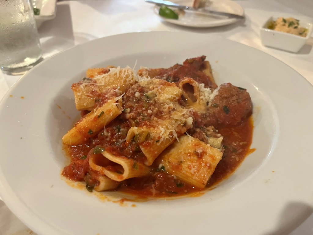 As we looked over the menu and heard that the pastas were made on-premises we decided to focus on that part of the menu. We ordered a couple of Caesar salads to begin, plus the “Sunday Gravy,” Potato gnocchi alla Vodka and the Chicken Parmesan that is served with rigatoni alla Vodka. Any restaurant that serves alla Vodka as the side to the Parm is OK in my book.