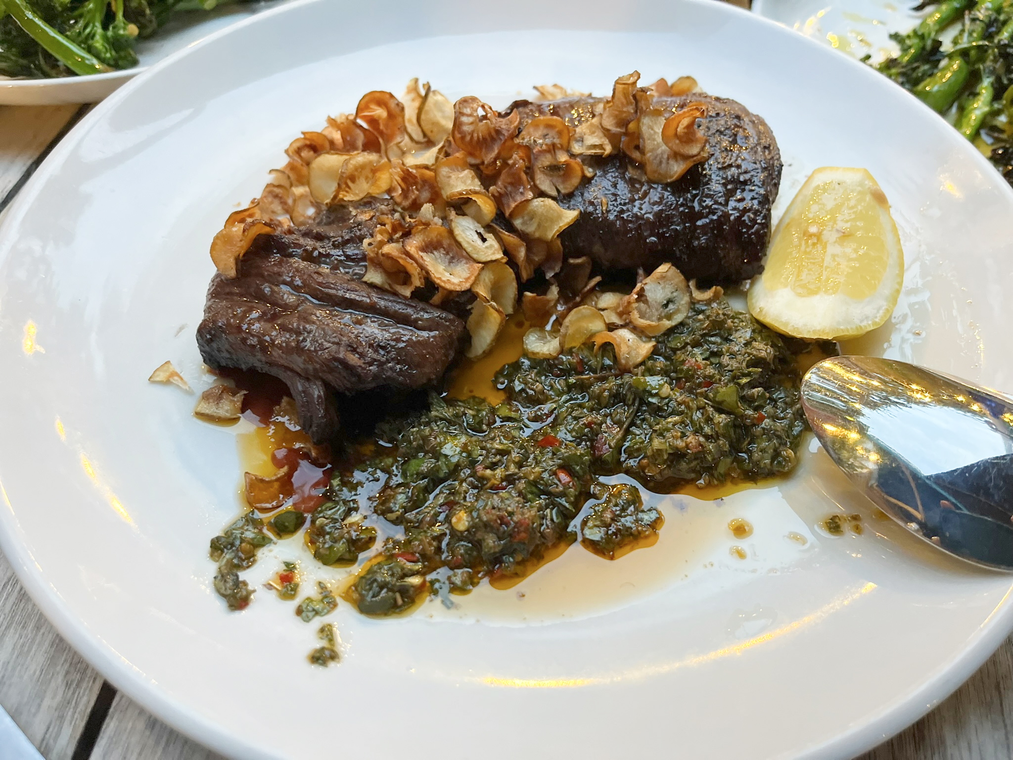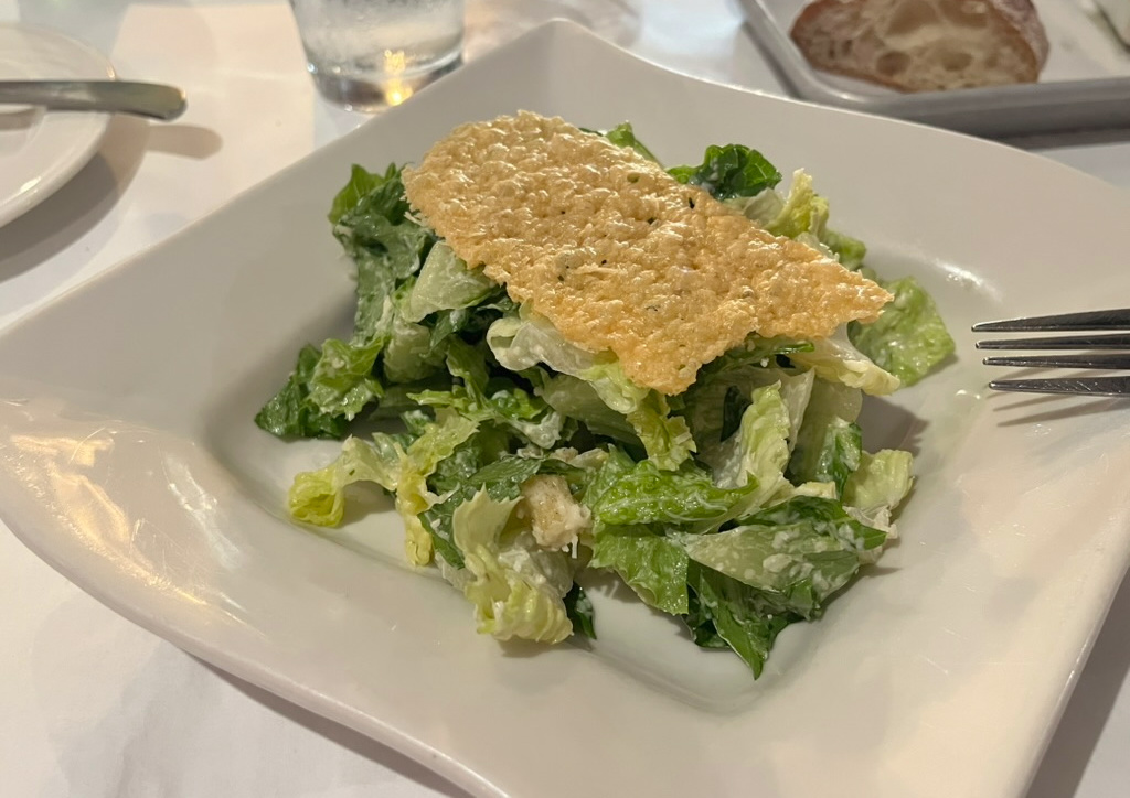 Two of us split a “Caesar Romaine, Grilled Garlic Croutons, Creamy Parmesan Dressing, White Anchovies” ($12) and it was very good. The Romaine was topped with a Parmesan crisp, and since I asked for the anchovy on the side, I sliced and diced these two additions into the salad. The romaine was crispy, fresh and the dressing was sparingly applied and offered a nice flavor. It was a very good way to start the meal. I give the Caesar salad a 7.