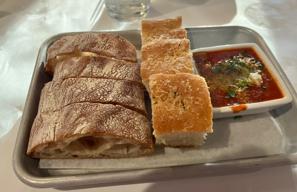 As we waited for our salads, the server brought a plate of bread and ciabatta and she told us, “I asked for the humus a couple of times and I think we are out, so I brought some red sauce.” Ten minutes later the humus joined the table. The bread and ciabatta were good, and I liked the red sauce for dipping.