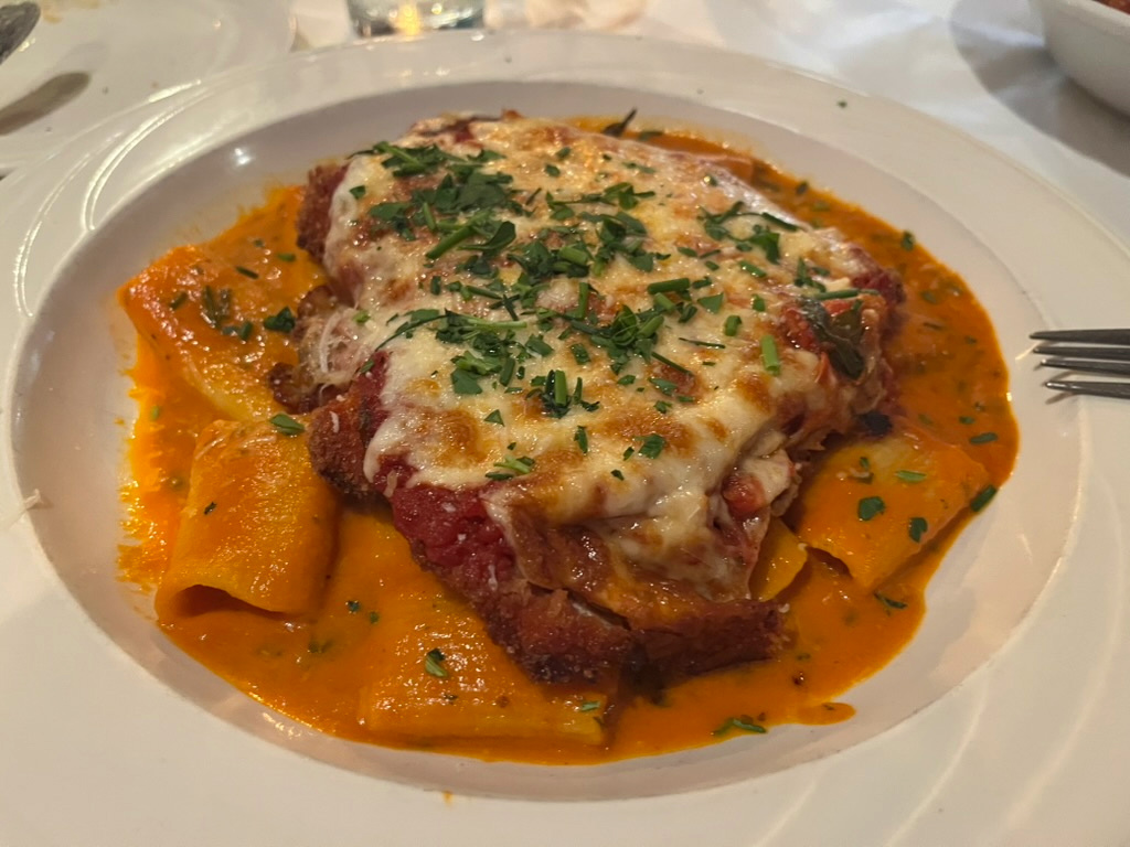 As we looked over the menu and heard that the pastas were made on-premises we decided to focus on that part of the menu. We ordered a couple of Caesar salads to begin, plus the “Sunday Gravy,” Potato gnocchi alla Vodka and the Chicken Parmesan that is served with rigatoni alla Vodka. Any restaurant that serves alla Vodka as the side to the Parm is OK in my book.