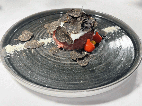 We began with two appetizers. The first was an off-menu suggestion from the server (thank you) that instantly secured its place among my top ten dishes of all time, Bison Tartare with poached egg and black truffles. A large, cylindrical mound of impeccably seasoned chopped bison was crowned with a poached egg and generously adorned with slices of black truffle. The bison was surprisingly mild and paired with some of the finest truffles I’ve ever tasted, the dish transcended description. Those opening bites were moments I will remember forever. And set the tone for the evening.