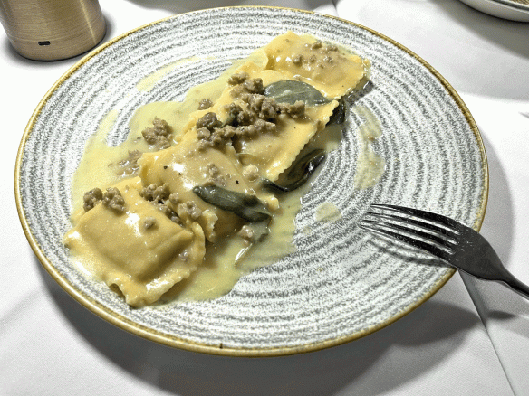 On the more aromatic end of Piedmontese cuisine was the Ravioli Romagnola al Burro, Salvia e Salsiccia. Filled with pumpkin and amaretti, the ravioli were dressed in a butter and sage sauce and finished with a sprinkling of sausage. The pumpkin filling was outstanding, rich and velvety, and paired beautifully with the subtle sweet nuttiness of the amaretti. While the butter and sage sauce would have been perfect on its own, the addition of sausage elevated the dish to another level.