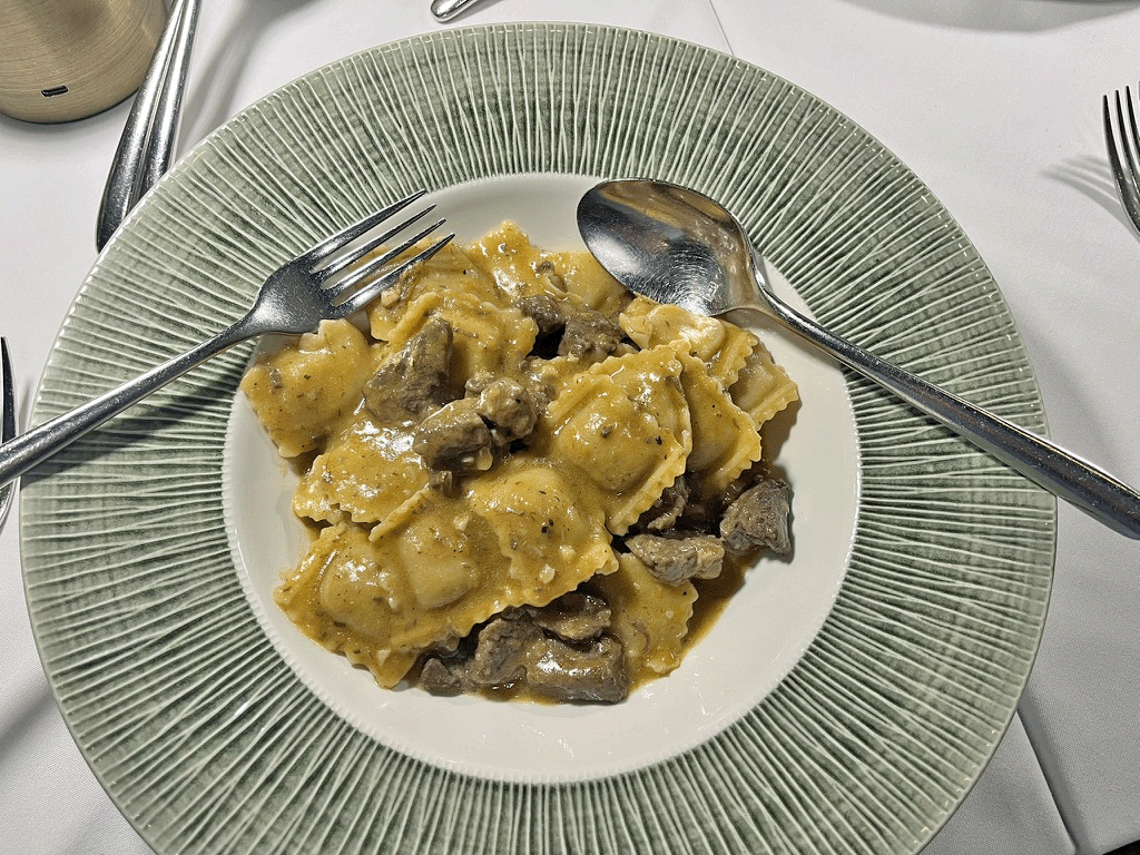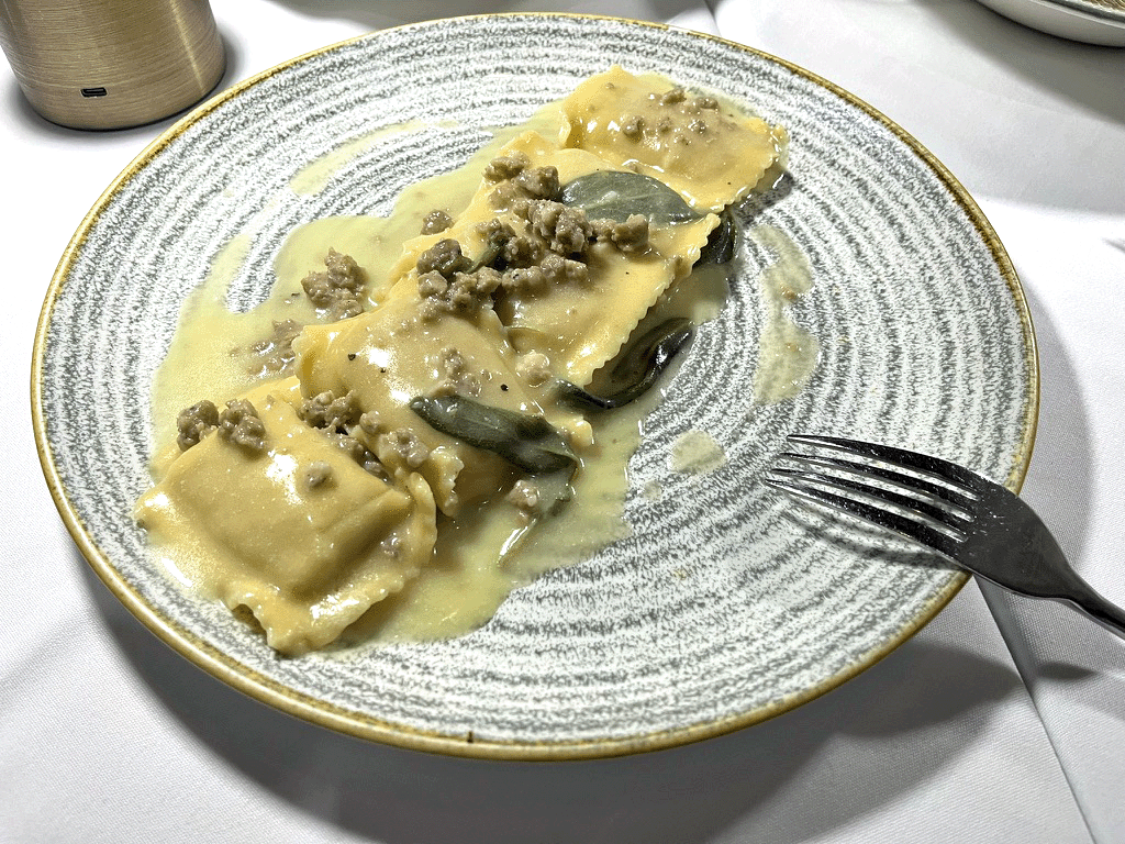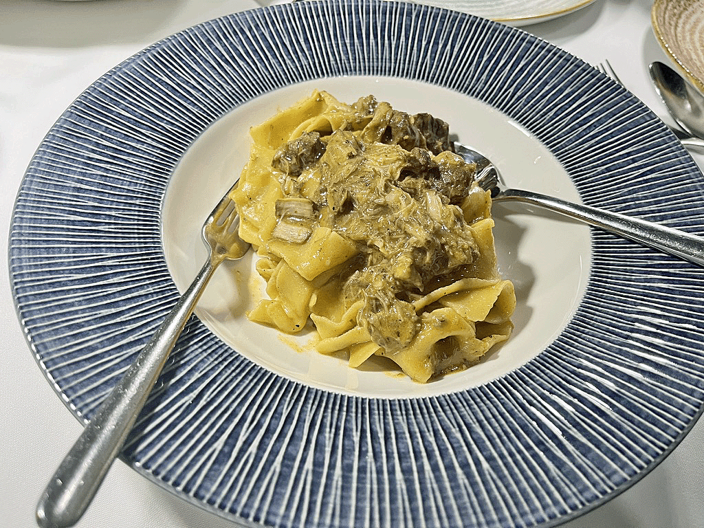 The boldest of the trio was the Agnolotti di Carne al Sugo di Brasato al Barolo. House-made pasta parcels, stuffed with beef, pork, and rabbit, were served in a deeply savory braised meat sauce. This was not a dish for the faint of heart, each bite was intense, hearty, and deeply satisfying, with soft textures and pronounced flavors. For those seeking richness and complexity, this dish delivered in full.