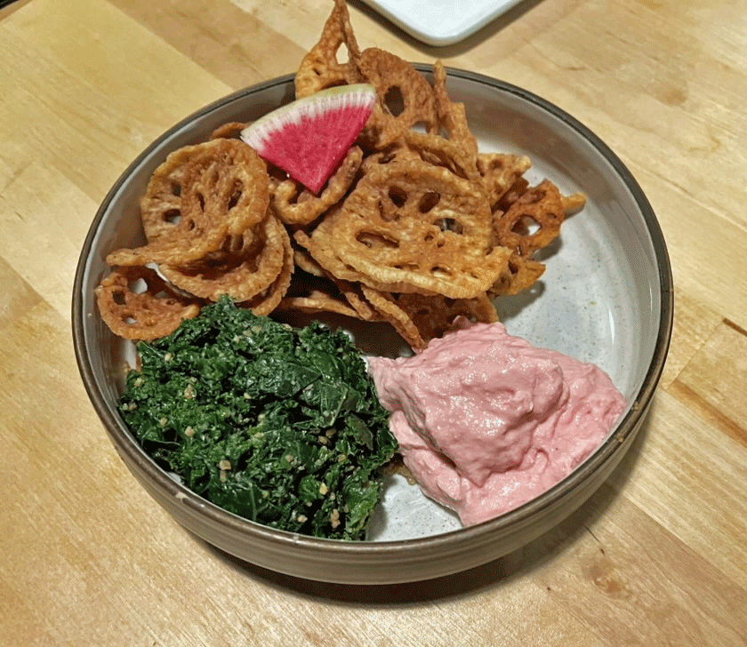 Two smaller plates were also delicious, the Kale Tofu Goma-ae (kale, beets, tofu, lotus root, sesame sauce) and the Yuzu Edamame (sautéed edamame with rayu, yuzu juice, salt, and sesame). The kale salad was unlike any I’ve eaten. The mound of kale was perfectly dressed, the pureed beets surprisingly toned down, and the crispy lotus root added a fantastic finishing crunch. And while most places serve edamame simply steamed with a sprinkle of salt, The Loop took this traditional shared starter in a completely different direction. They sautéed the pods with an added uncharacteristic spiciness and elevated a simple ingredient into something memorable.