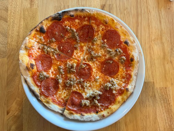 For my order, I kept things classic, a small pie, half plain for tradition’s sake, and the other half adorned with sausage and pepperoni.