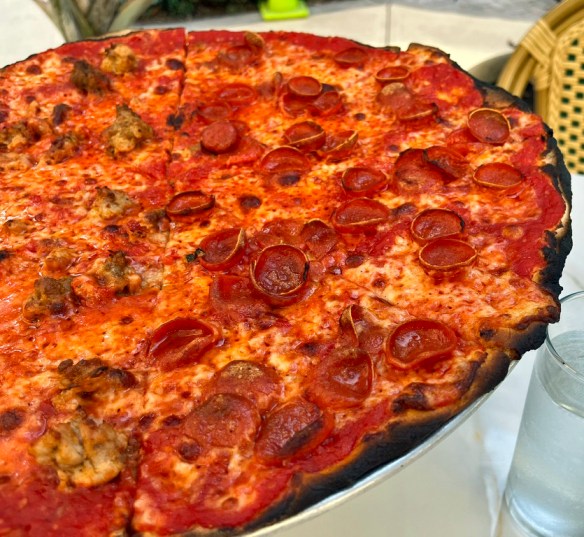 When it hit the table, I was impressed. The sauce extended almost to the edge, leaving just a small border of beautifully charred crust from the coal fire. The sauce itself was a deep, rich red, applied generously but not excessively. The cheese was evenly layered, and the toppings were abundant without being overdone, hearty chunks of sausage and curled slices of pepperoni with a touch of oil in many of them.