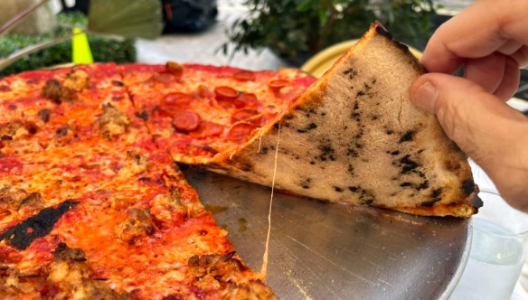 I next checked the underside, and it was perfectly baked, lightly charred, thin, crisp with hints of charring. I took a full bite of the sausage slice first. It was pizza heaven. The crust crunched, the sauce delivered deep tomato richness, the cheese added luscious creaminess, and the sausage tied it all together beautifully. Any initial hesitation with the sausage vanished completely. In combination, the sausage slice was perfectly balanced. It was one of the finest sausage slices I’ve ever had.